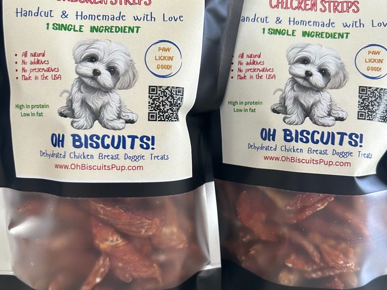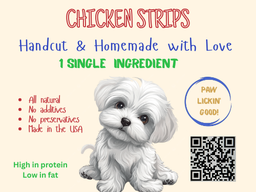 Our homemade CHICKEN STRIPS contain ONLY one (1) ingredient for a clean, 100% pure, natural, healthy & DELICIOUS experience for our cats and our dogs. The ingredients are 100% human food and pup-a-licious!